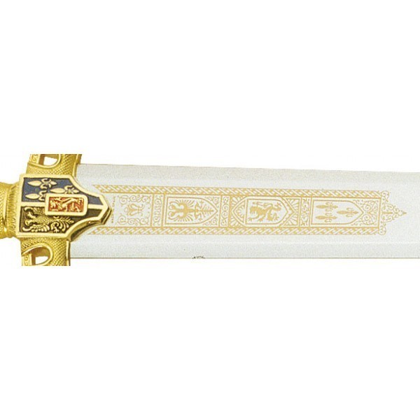 The Sword of Roland by Marto of Toledo has a tempered steel blade, ornamented with 24K Gold engravings on the upper part. The 24K Gold plated cast metal hilt has the quillons, in the design of twin Lions heads, bended toward the blade with a heraldic shield and crest centered. The leaf-shaped pommel and is decorated with relief figures.