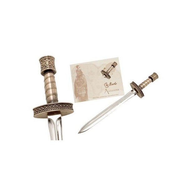 Miniature Alexander The Great Sword Bronze by Marto Swords, Toledo Spain. Ancient Greek sword of the greatest general in human history. Licensed Alexander 2004 movie replica. 7 1/2 inches, bronze finish.