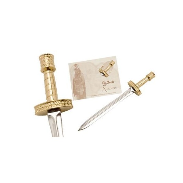 Miniature Alexander The Great Sword Gold by Marto Swords, Toledo Spain. Ancient Greek sword of the greatest general in human history. Licensed Alexander 2004 movie replica. 7 1/2 inches, gold finish.