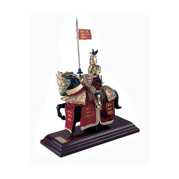 King Richard the Lionheart riding a horse standing on a wooden platform. The knight wears a parade suit of armor composed of a great helm with crest, a cuirass with pauldrons and bracelets and greaves on the legs. The basin and hoses are covered with red colored velvet breeches. The knight is armed with a round shield, a jousting lance with banner and a sword. The horse also is harnessed with metal parade armour enriched with relief sculpted figures and a red colored velvet caparison.